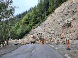 Muntele o ia din nou la vale, la Broșteni, carosabilul e acoperit de stânci FOTO